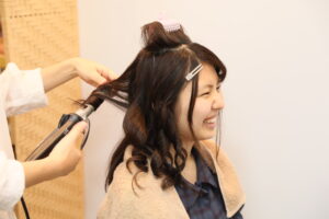 また、振袖選びで重要なことは、ヘアスタイルです。羽衣では振袖選びの際に「無料のヘアアレンジ体験」を実施しています。まずはやってみたいヘアスタイルをお伺いしたり、アドバイスをしながら、ご試着前に振袖に合うヘアスタイルに仕上げていきます。ヘアスタイルが仕上がった状態で、振袖選びができるので、気姿のイメージがしやすくなり、理想の一着を見つけやすくなります。